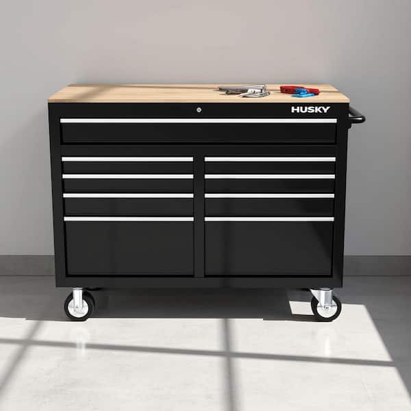 Questions and Answers for Husky Tool Storage 46 in. W x 18 in. D 9-Drawer Mobile Workbench Cabinet in Gloss Black