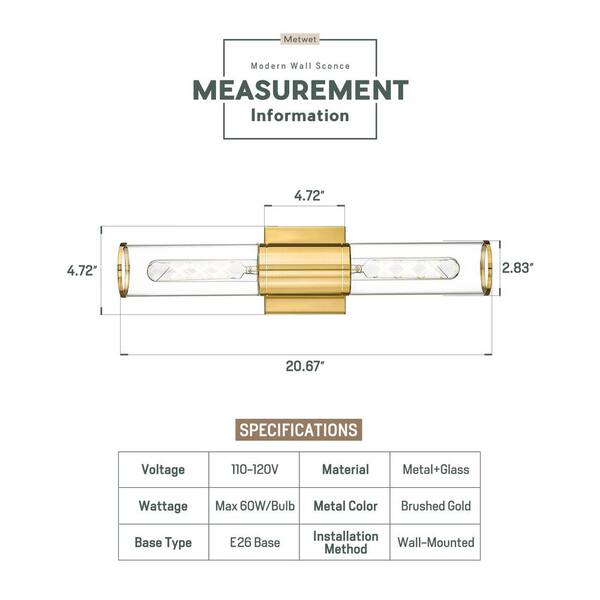 20.67 in. 2-Light Brushed Gold Vanity Light with Clear Glass Shade