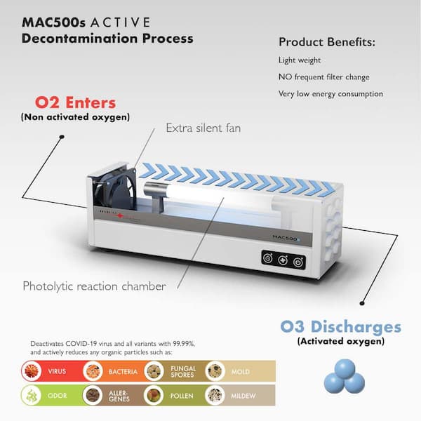 - Kills 99.9% of airborne bacteria, viruses and odor