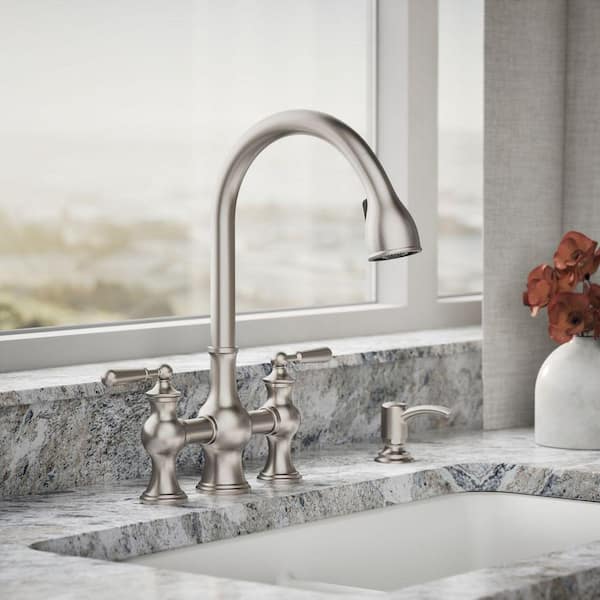 Questions and Answers for KOHLER Capilano 2-Handle Bridge Farmhouse Pull-Down Kitchen Faucet with Soap Dispenser and Sweep Spray in Vibrant Stainless