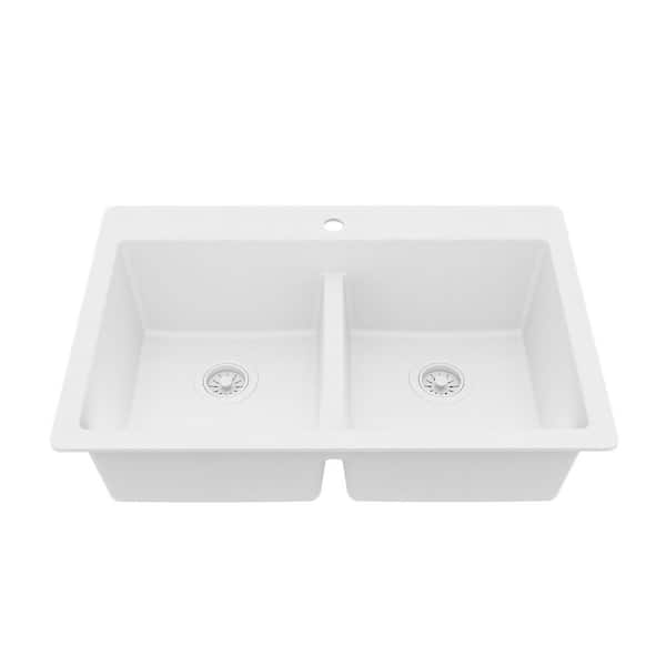 Questions and Answers for Karran White Quartz 33 in. 50/50 Double Bowl Composite Drop-in Kitchen Sink