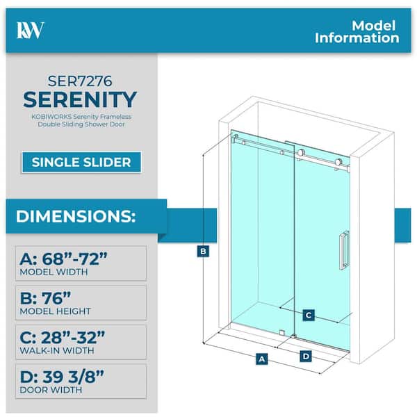 Questions and Answers for Kobiworks Serenity 72 in. W x 76 in. H Single Sliding Frameless Shower Door in Matte Black with 3/8" Clear Glass