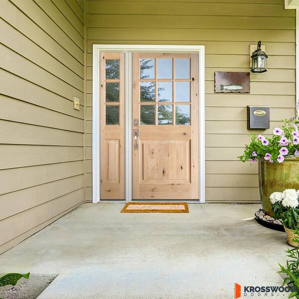 Be the first to ask a question for Krosswood Doors 50 in. x 80 in. Craftsman Knotty Alder 9-Lite Unfinished Right-Hand Inswing Prehung Front Door with Left Hand Sidelite