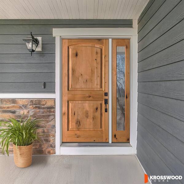Questions and Answers for Krosswood Doors 56 in. x 80 in. Knotty Alder 2Panel Arch-Top Left-Hand/Inswing Clear Glass cedar Stain Wood Prehung Front Door w/ RFSL