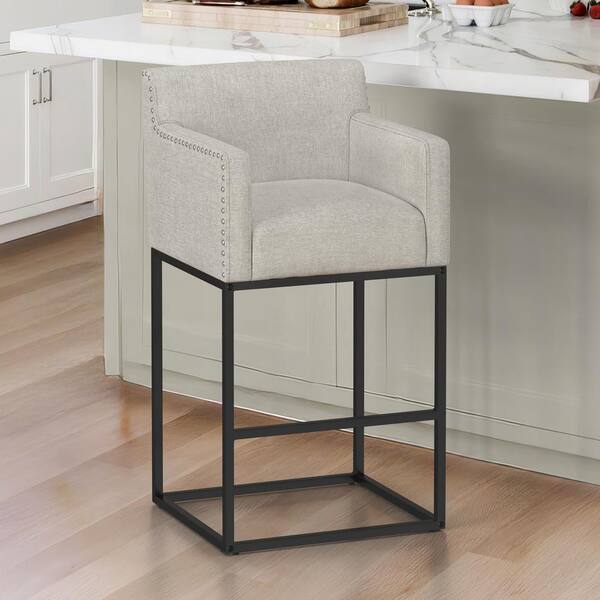 Hampton 30 in. Beige Gray Modern Linen Upholstered Bar Stool Square Metal Frame Counter Height Bar Stool