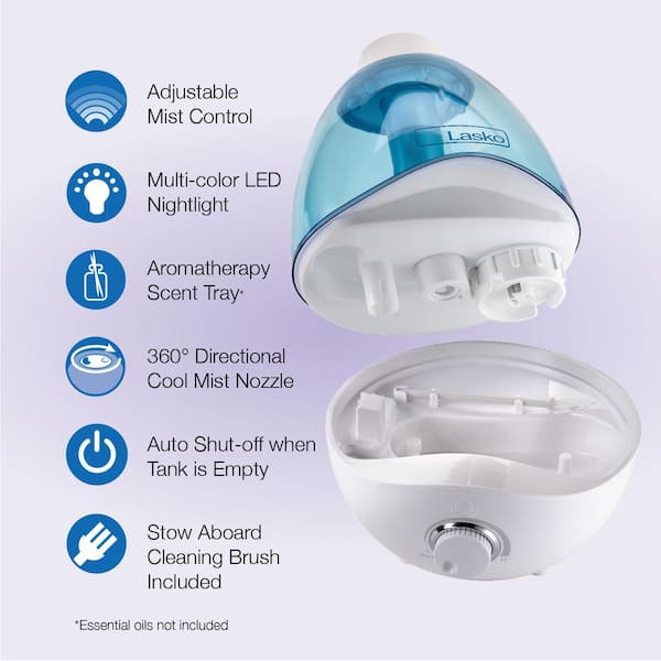 Be the first to ask a question for Lasko 0.74 gal. Ultrasonic Cool Mist Humidifier for Rooms up to 300 sq. ft. in Blue/White with 60 Hour Runtime on Low