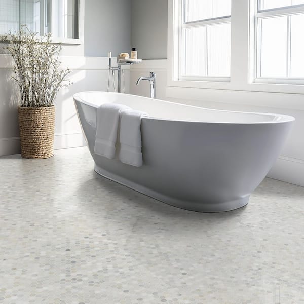 - Polished marble hexagon mosaic in white and gray tones