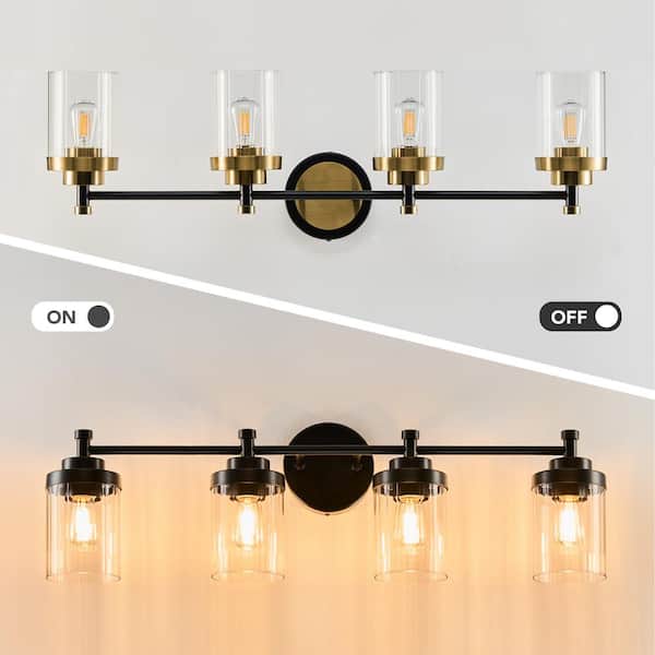 31.5 in. 4-Light Black and Brass Modern Dimmable Vanity Light with Clear Ribbed Glass Shades E26 Sockets