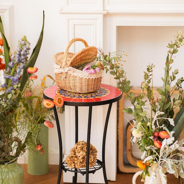 Metal Outdoor Side Table with Ceramic Tile Top and Display Shelf, Red