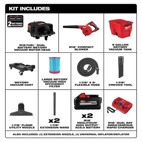 Questions and Answers for Milwaukee M18 FUEL 9 Gal. Cordless Dual-Battery Wet/Dry Shop Vacuum Kit with M18 Compact Blower