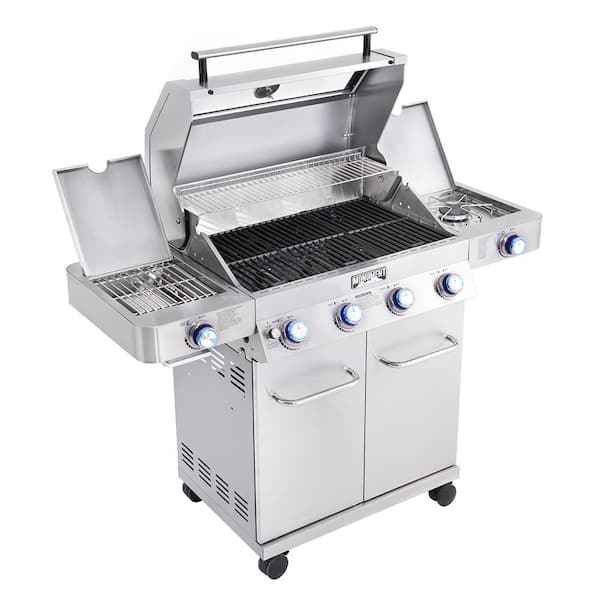 Questions and Answers for Monument Grills 4-Burner Propane Gas Grill in Stainless with Clear View Lid, LED Controls, Side and Sear Burners