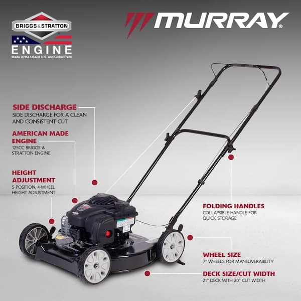 Questions and Answers for Murray 20 in. 125 cc Briggs & Stratton Walk Behind Gas Push Lawn Mower with 4 Wheel Height Adjustment and Prime 'N Pull Start