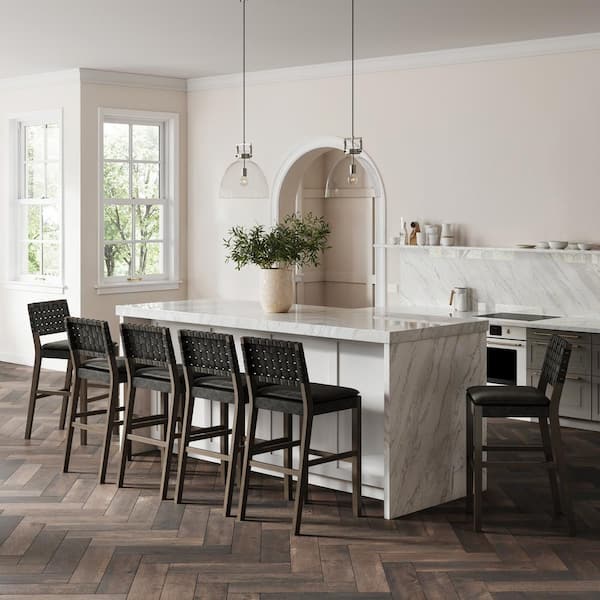 Questions and Answers for Nathan James Cohen 29 in. Mid-Century Modern Brushed Black Solid Wood Bar Stool with Faux Leather Cushioned Seat and Back (Set of 6)