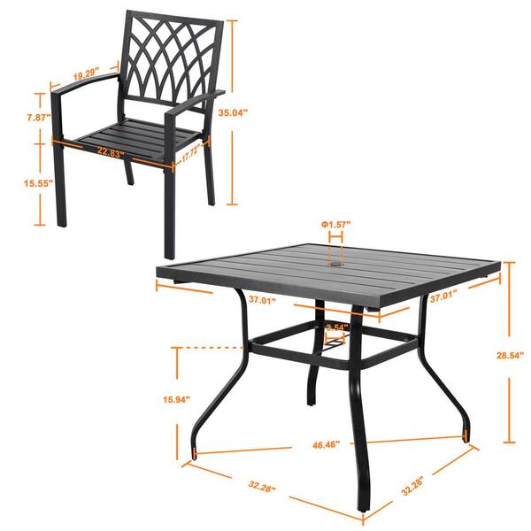 Questions and Answers for Nuu Garden Black 5-Piece Iron Outdoor Dining Set, 4 Stackable Chairs and 37 in. Square Dining Table with Umbrella Hole