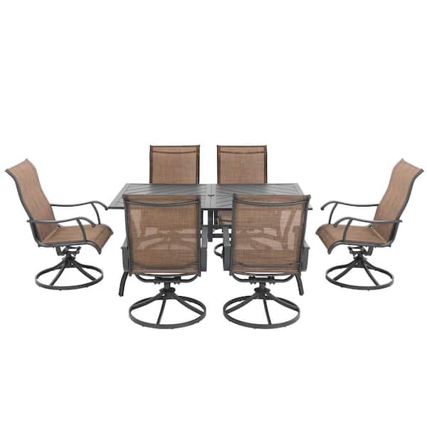 Be the first to ask a question for Nuu Garden Brown and Black 7-Piece Textilene and Iron Metal Dining Table with Swivel Design and Umbrella Hole