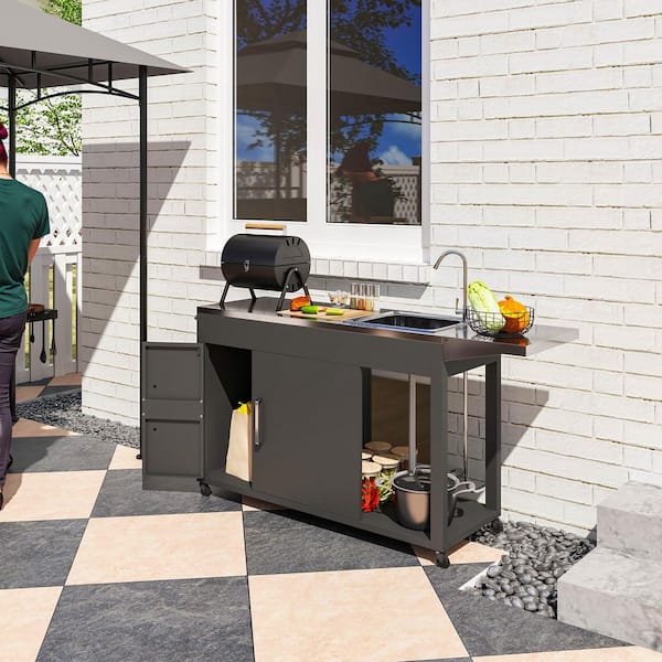 Be the first to ask a question for Outsunny Dark Gray Outdoor Grill Table with Stainless Steel Sink and Drainage, Grill Cart with Foldable Side Table and Cabinet
