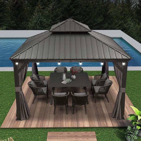12 ft. x 12 ft. Gray Patio Outdoor Gazebo for Backyard Hardtop Aluminum Frame with Hooks, Netting, Curtain 24-Lights