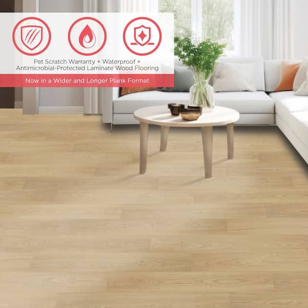 - Extra-wide and extra-long laminate planks in warm, natural tones