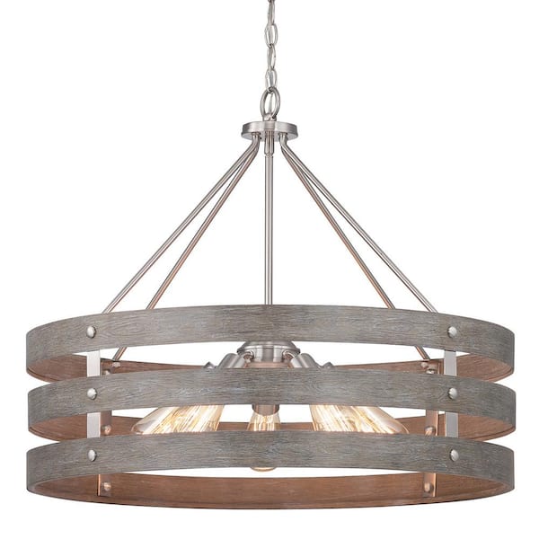 Questions and Answers for Progress Lighting Gulliver 27-3/4 in. 5-Light Brushed Nickel Farmhouse Drum Chandelier with Weathered Gray Wood Accents for Dining Room