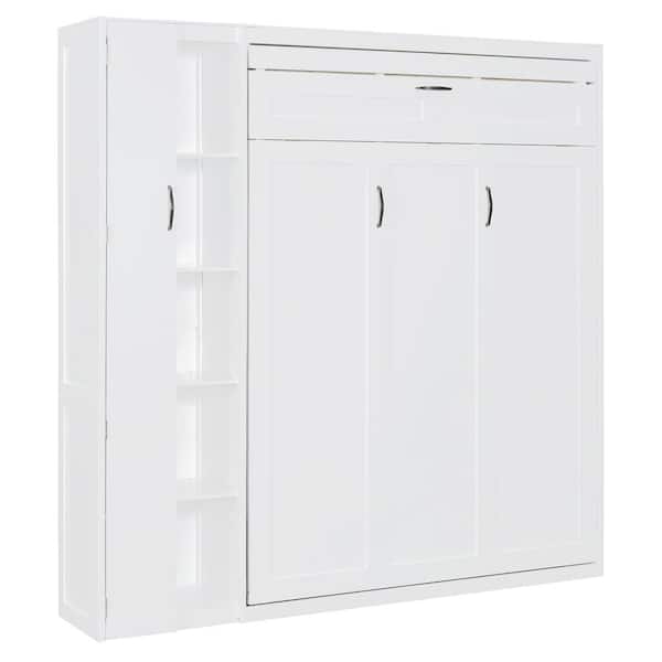 Be the first to ask a question for Qualler White Wood Frame Full Size Murphy Bed with LED Lights, Wardrobe and Shelves