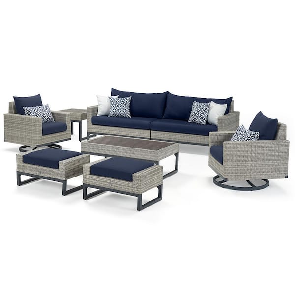 Milo Gray 8-Piece Motion Wicker Patio Seating Set With Navy Blue Cushions
