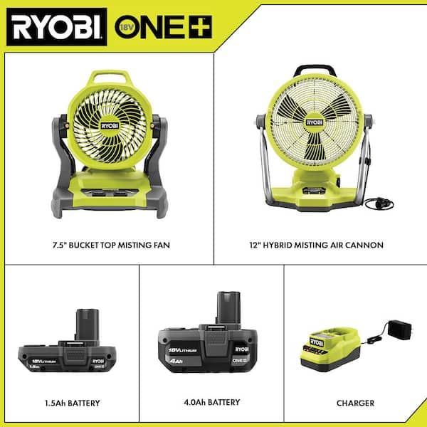 Questions and Answers for RYOBI ONE+ 18V Cordless Hybrid WHISPER SERIES Misting Air Cannon Fan and Bucket Top Misting Fan Kit w/ Batteries & Chargers