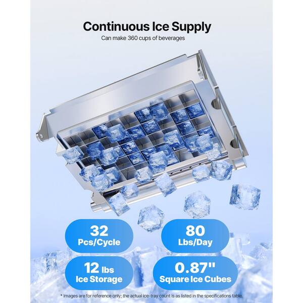 32 cubes/cycle, 80 lbs/day, 12 lbs storage.