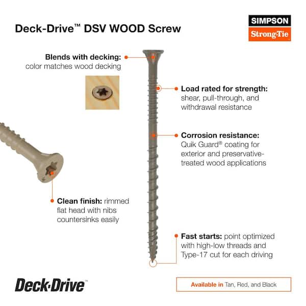 Questions and Answers for Simpson Strong-Tie #10 x 3-in T25, Flat Head, Deck-Drive DSV Wood Screw, Quik Guard, Tan (70-Pack)