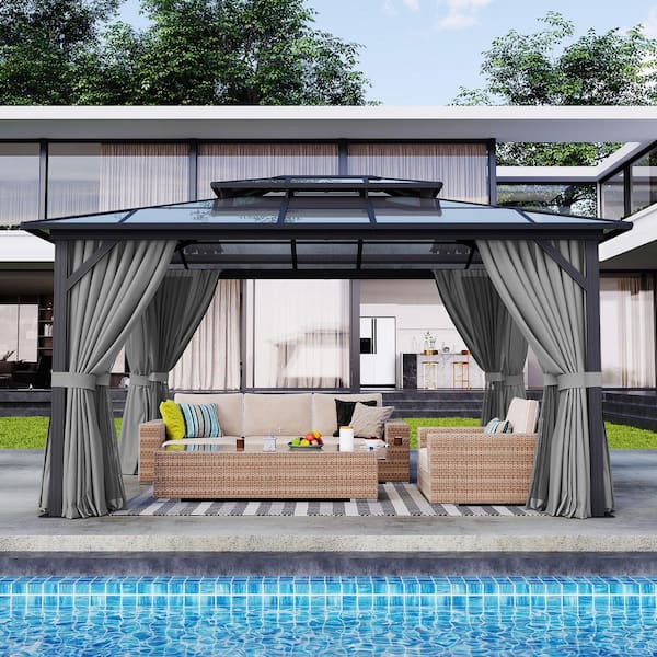 Questions and Answers for Sizzim 12 ft. x 14 ft. Gray Outdoor Gazebo, Polycarbonate Double Roof Aluminum Frame Gazebo with Curtains and Netting