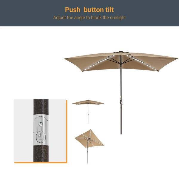 Questions and Answers for Sonkuki LED 10 ft. x 7 ft. Aluminum Frame Market Solar Rectangle Patio Umbrella in Taupe, With a Crank and Tilt Button