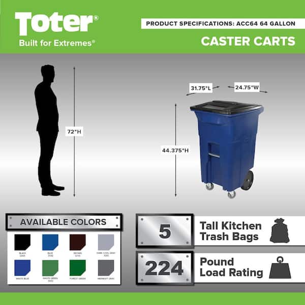 Questions and Answers for Toter 64 Gal. Blue Trash Can with Wheels and Lid (2 caster wheels 2 stationary wheels)