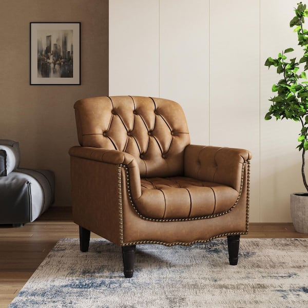 Questions and Answers for Uixe Mid-Century Light Brown Faux Leather Button Tufted Accent Arm Chair with Wood Legs (Set of 1)