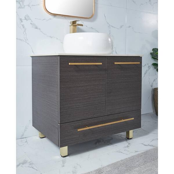 Questions and Answers for VC CUCINE 30 in. W x 20.5 in D. x 33 in. H Bathroom Vessel Sink Vanity in Black Wood Grain with White Slate Top with Single Basin