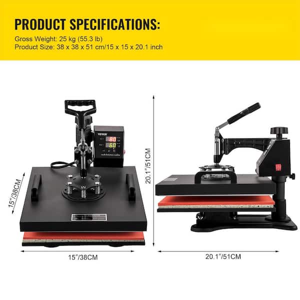 Be the first to ask a question for VEVOR 15 in. L x 15 in. W Heat Press Machine 8 in 1 Dual LED Display 360° Rotation Swing Away T-Shirt Press Machine, Black