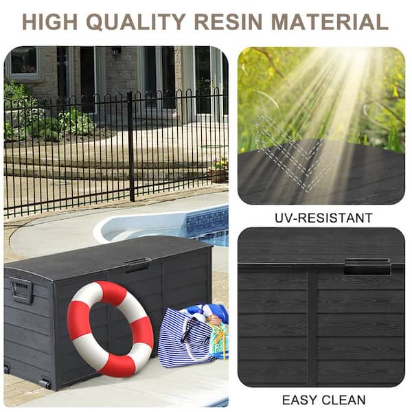 Questions and Answers for VINGLI 75 Gallon Outdoor Storage Box with Lid, Lockable Plastic Patio Deck Box for Garden, Pool, Balcony, Yard (Full Black)