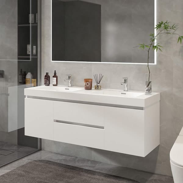 Questions and Answers for Vanity Art Annecy 60 in. W x 18.5 in. D x 20 in. H Bathroom Wall Hung Vanity in White with Double Basin Top in White Resin