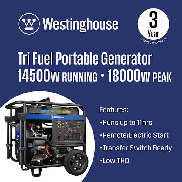 Be the first to ask a question for Westinghouse 18,000/14,500-Watt Tri-Fuel Gas, Propane, Natural Gas Powered Portable Generator with Remote Electric Start, 50A Outlet
