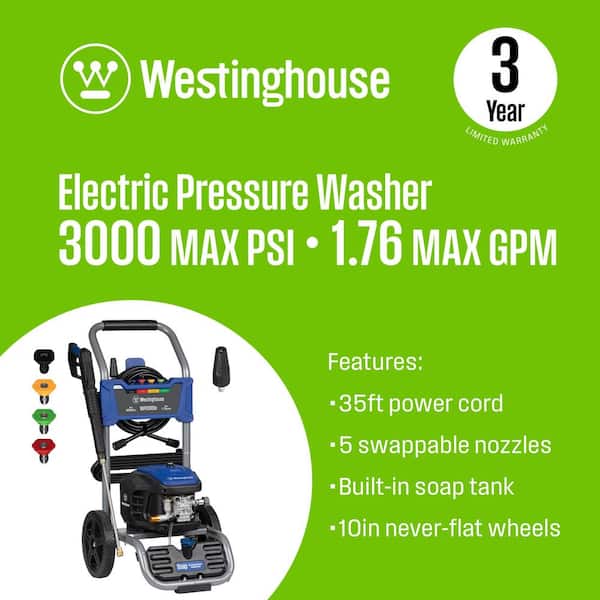 Questions and Answers for Westinghouse 3000 PSI 1.76 GPM 13 Amp Cold Water Electric Powered Pressure Washer with Turbo Nozzle and 5-Quick Connect Tips