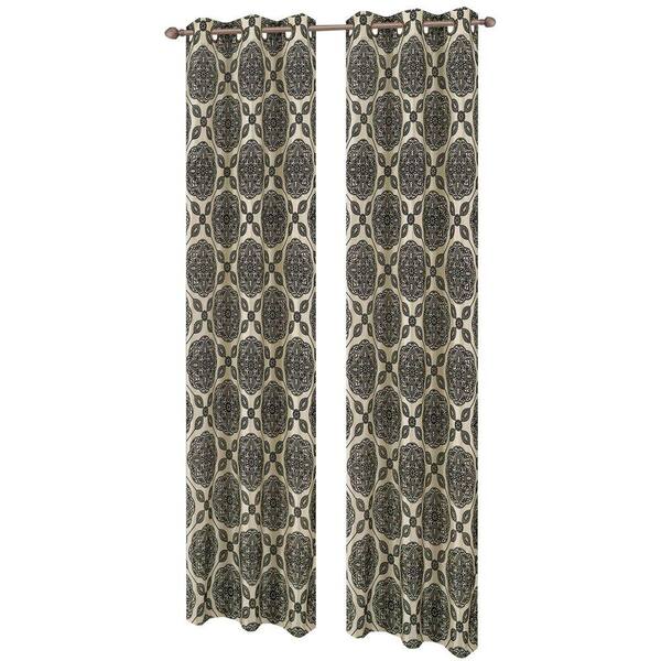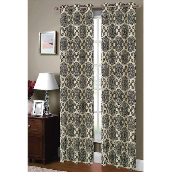 Semi-Opaque Diamante Flocked Faux Silk 84 in. L Grommet Curtain Panel Pair, Ivory/Black (Set of 2)