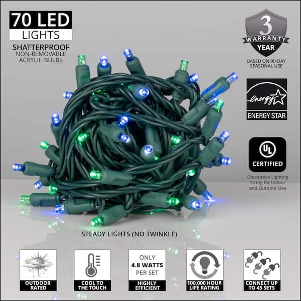 Questions and Answers for Wintergreen Lighting 24 ft. 70-Light Blue and Green 5 mm LED Mini Light Set