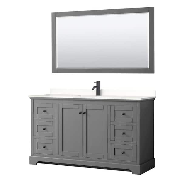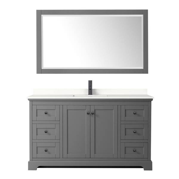 Be the first to ask a question for Wyndham Collection Avery 60 in. W x 22 in. D x 35 in. H Single Bath Vanity in Dark Gray with White Quartz Top and 58 in. Mirror