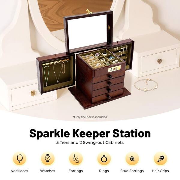 Questions and Answers for YIYIBYUS Lockable MDF Wooden Jewellery Box with Built-in Mirror 5 Drawers and 2 Swing-out Cabinets