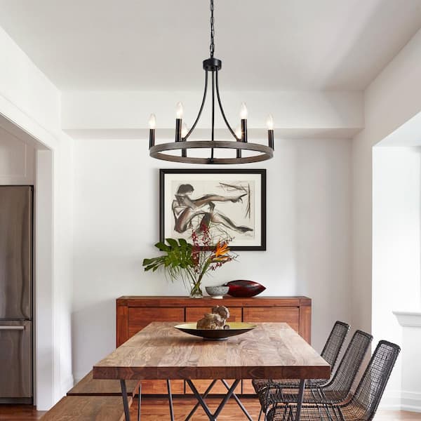 Questions and Answers for ZJVAIVE 6-Light Farmhouse Black and Imitation Wood Grain Candlestick Circle Wagon Wheel Chandelier Lighting for Kitchen Island