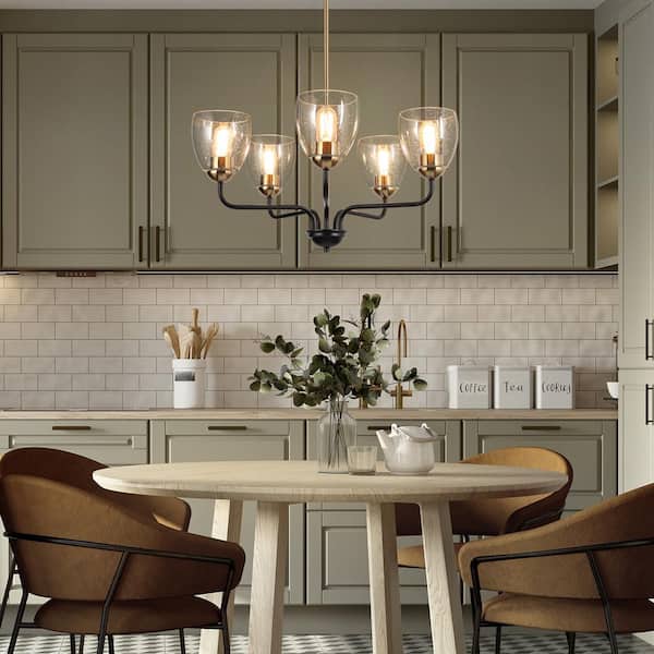 Questions and Answers for Zevni 24.5 in. 5-Light Modern Black and Brass Pendant Light, Rustic Dining Room Chandelier, Seeded Glass Round Chandelier