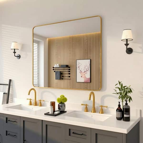 Be the first to ask a question for niveal 42 in. W x 36 in. H Rectangular Framed Wall Bathroom Vanity Mirror in Brass