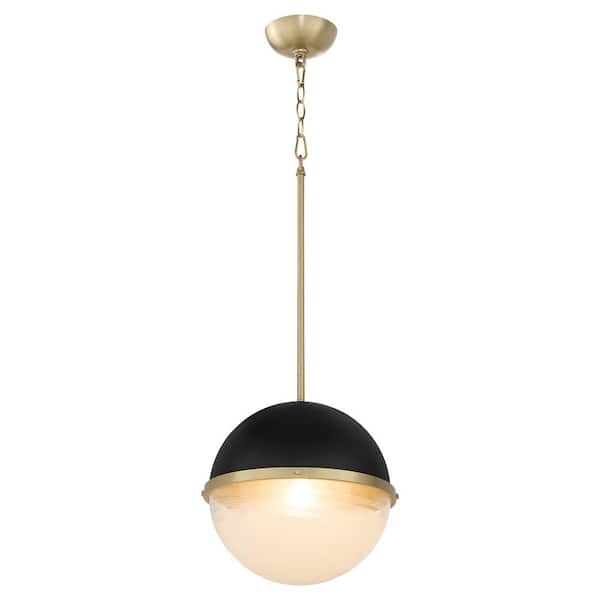 12 in. 1-Light 60-Watt Pendant Light with Milky Glass Sphere Textured Black / Aged Brass