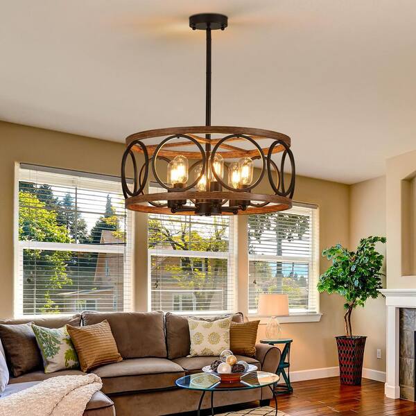 Modern Farmhouse 6-Light Black metal pole with brown wood Drum Chandelier for Dining Areas with No Bulbs Included