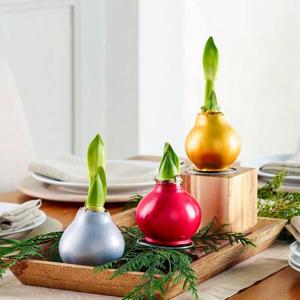 - Amaryllis bulb sheathed in silver wax yields stunning red blooms
