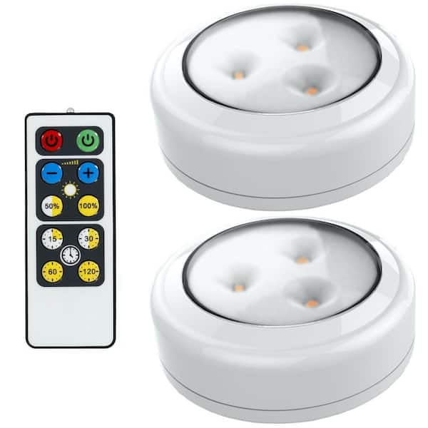 - Puck lights include a remote control with dimmer and timer
