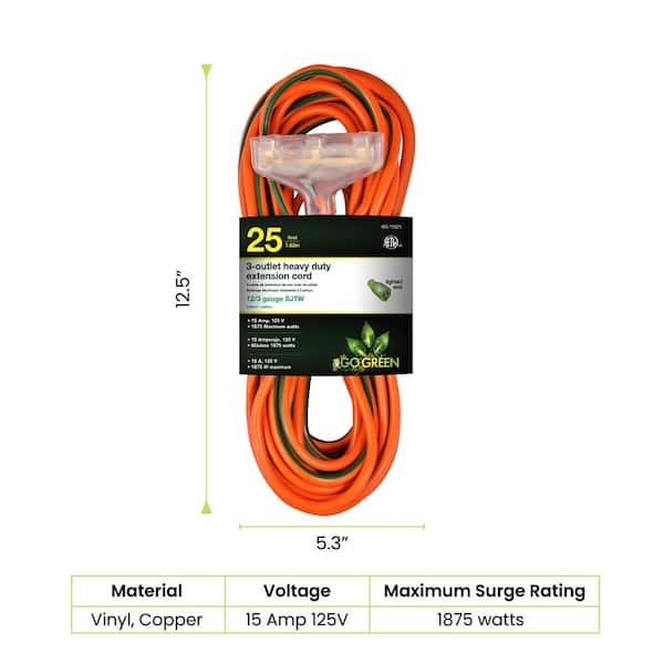 Customer Reviews for GoGreen Power 25 ft. 3-Outlet 12/3 Heavy Duty Extension Cord - Orange